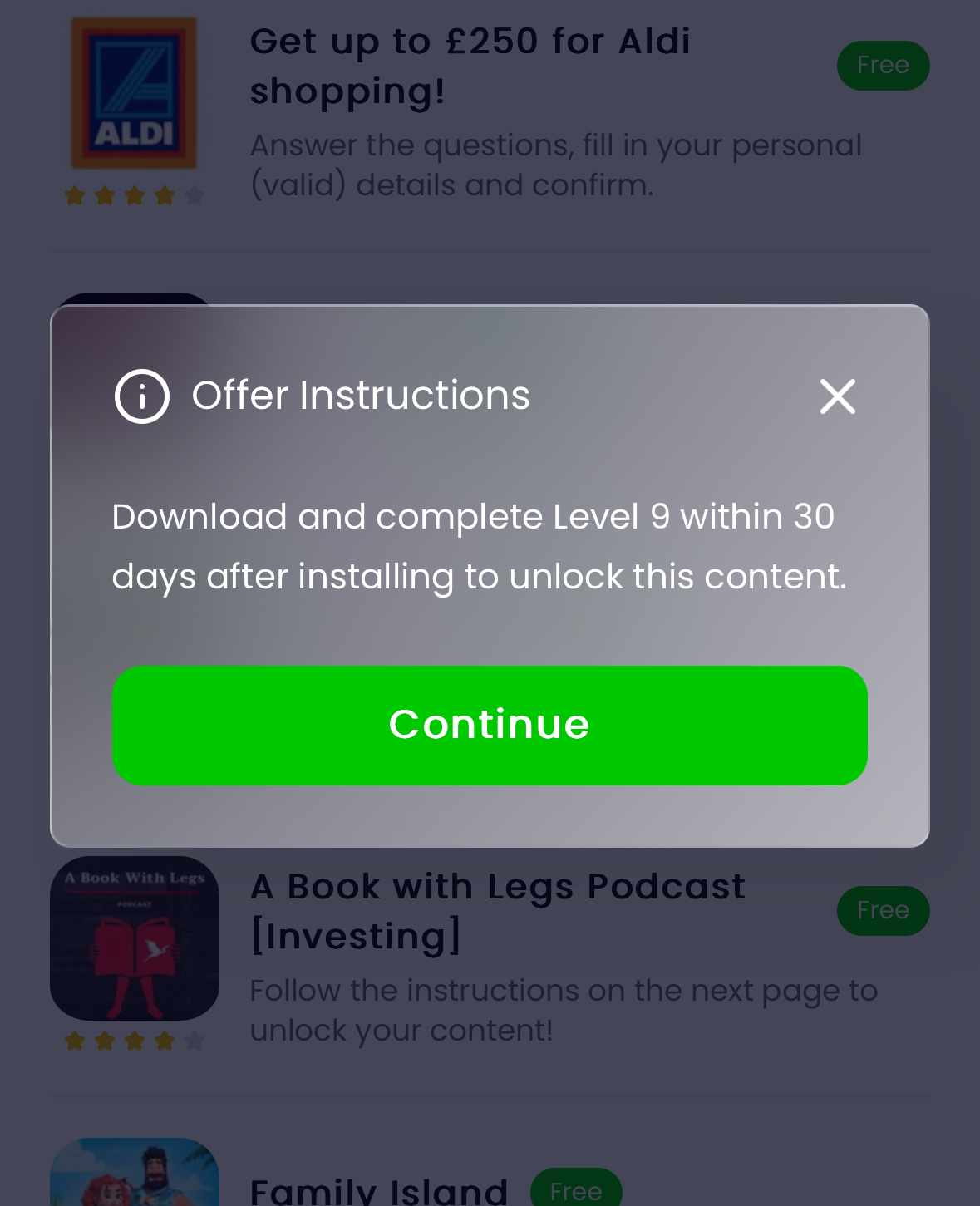 Step 1. Click Continue to reach the task page. Tasks will be country-specific, you may see Mobile Apps, Surveys, or both!